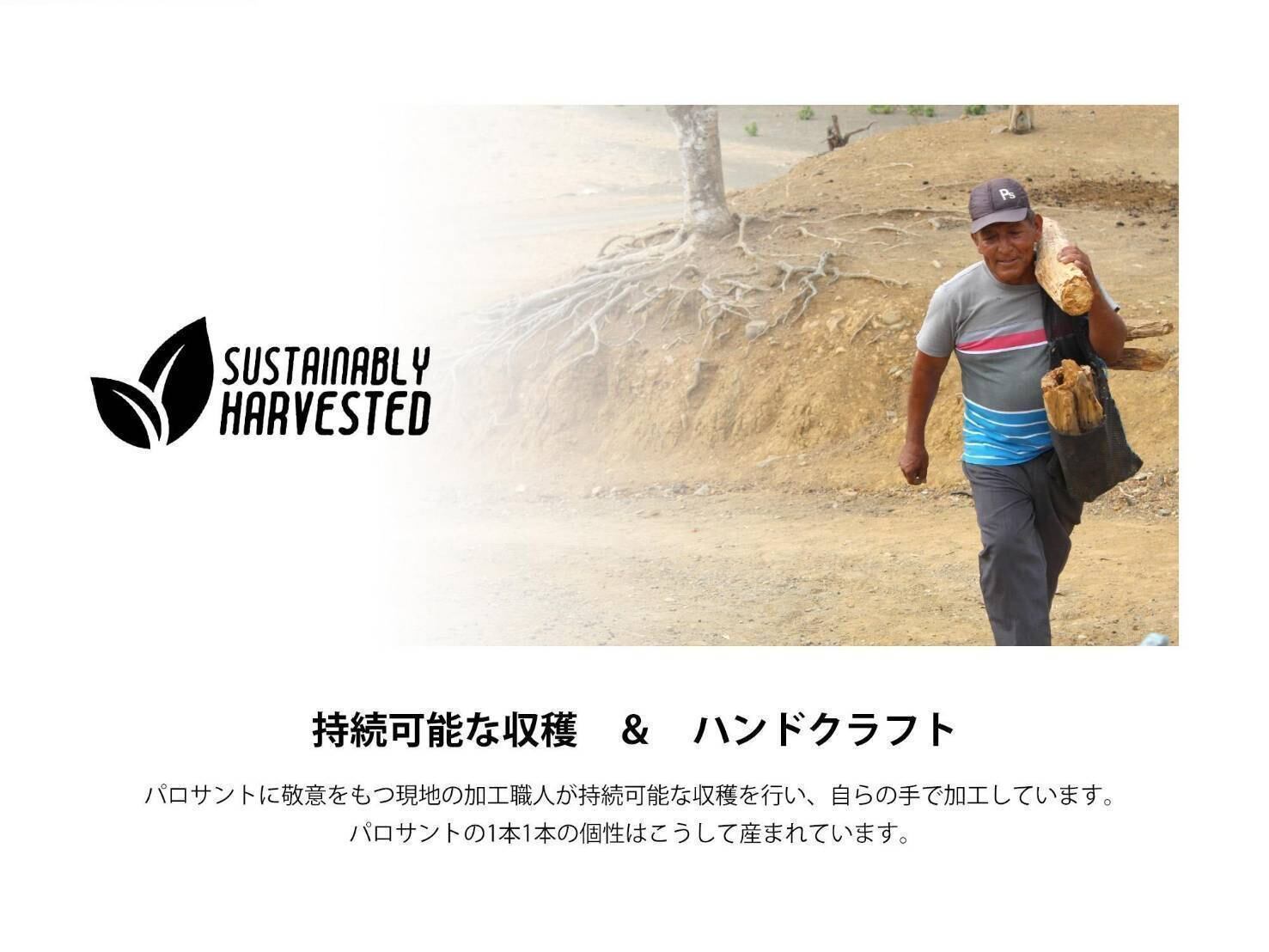 こちらのパロサントはペルー産パロサントで、苗木から育て植林し自然を守りつつ10年以上経って自然に枯れたパロサントの樹を伐採して使用しております。